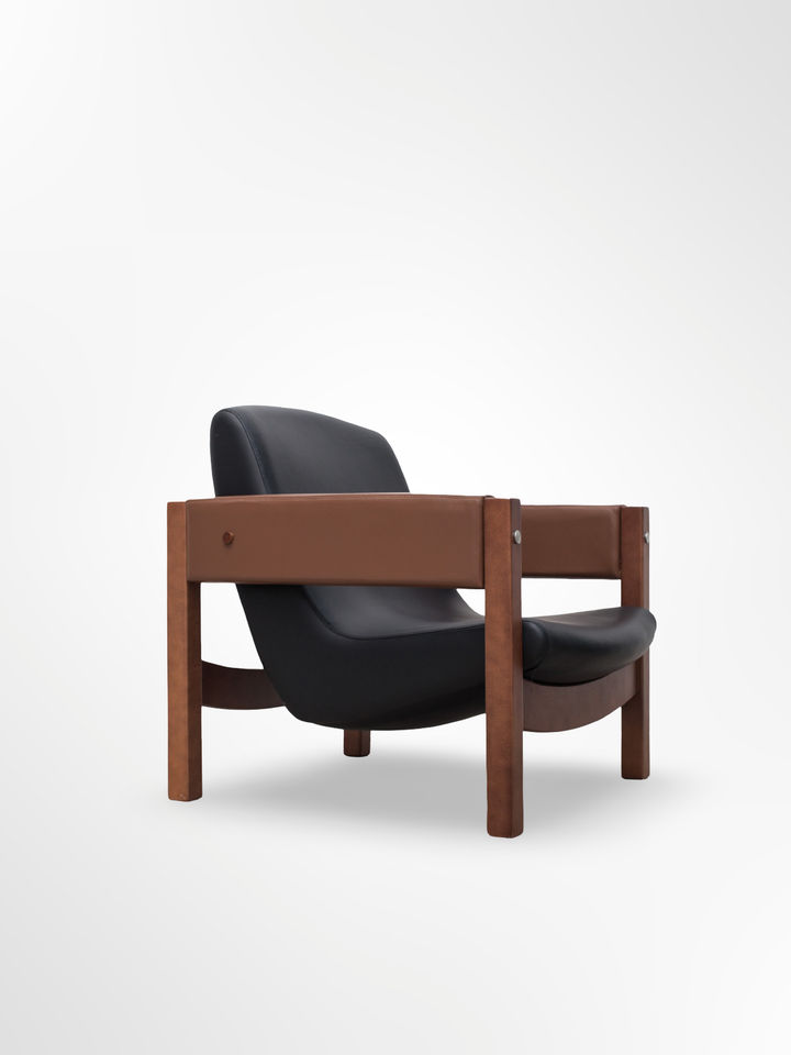 The Bola de Latão chair features a striking design: each front leg is capped with a brass sphere at the top - the translation of its name from Portuguese - and soft leather wrapped around a tubular iron structure and stretched using ties. It was produced only as a limited run of six for Lina Bo Bardi’s private Sao Paulo residence, the renowned Glass House. This authentic re-edition is authorized by the Lina Bo and P. M. Bardi Institute and comes with a certificate of authenticity.