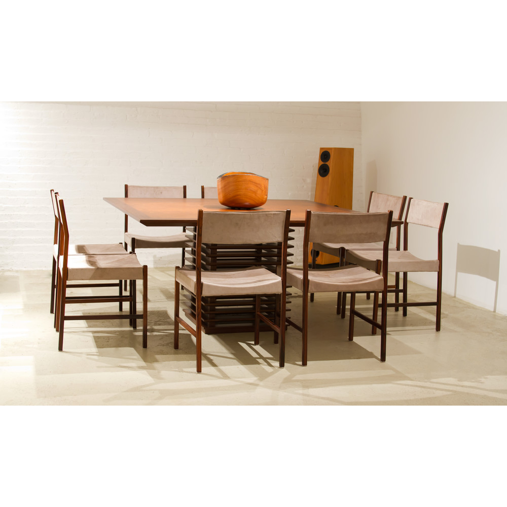 The Polish born Jorge Zalszupin moved to Brazil after World War II, where he found an opportunity to develop his extremely sensual, modern architecture. A desire to rebuild a new post-war world and a wave of development in Brazil proved an ideal time for this creative atmosphere to flourish. Graceful lines, strong use of local woods and a combination of impeccable woodworking and classical detailing mark Zalszupin’s furniture. He became part of a select team of talented furniture designers, who worked closely with Oscar Niemeyer on the conception and production of furniture for the new federal capital. The pieces he designed during this time utilized the luxury of leather and combined it with classical Brazilian rosewood.